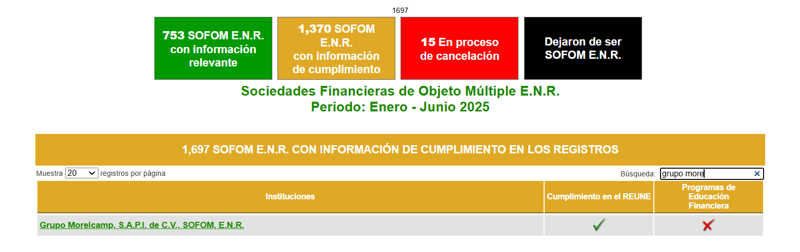 Esta información corresponde únicamente a Grupo Morelcamp, S.A.P.I. de C.V. SOFOM, E.N.R. Para conocer la información de todo el sector, puedes acceder al sitio https://www.buro.gob.mx/
